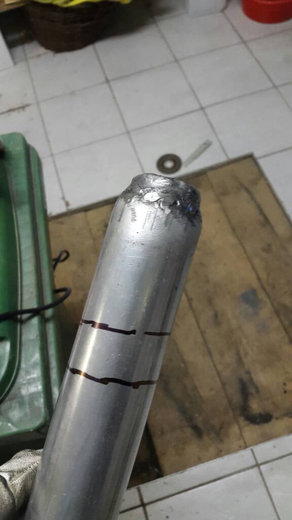 Prvo sam poravnao rupe na "čepovima" da cijev 50 ide u cijev od kromiranog nastavka..